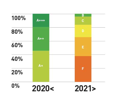 Stara skala energetske efikasnosti (od A+++ do D) postala je zbunjujuća jer su skoro svi novi uređaji imali oznaku A+, A++ ili A+++, pa su razlike među njima bile nejasne. Nova skala ide od A do G, bez pluseva, što omogućava jasniju kategorizaciju i ostavlja prostor za još efikasnije tehnologije koje će se pojaviti u budućnosti.